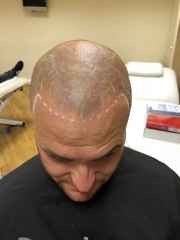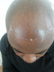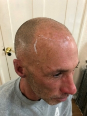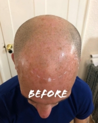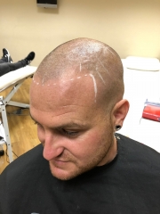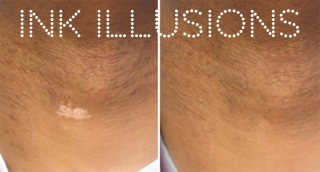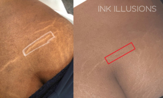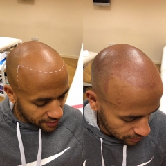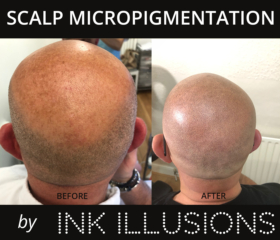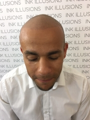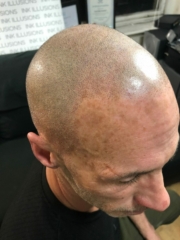 Please see below to see some before and after photo examples of hairline tattooing, scalp tattooing / micropigmentation, scar camouflage, stretch mark tattoo camouflage, and vitiligo camouflage.